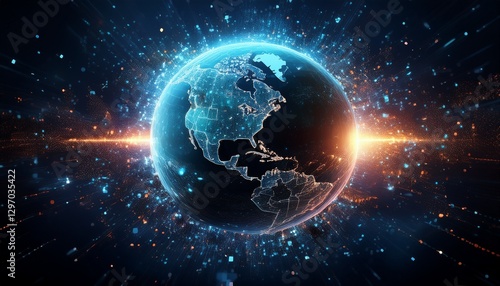 Obraz premium 거대한 행성이 픽셀처럼 해체되며 입자로 퍼지는 장면
