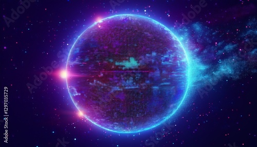 Obraz premium 거대한 행성이 픽셀처럼 해체되며 입자로 퍼지는 장면