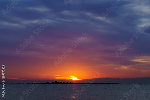 Naklejka premium 湘南 葉山 森戸海岸の夕日と海に浮かぶ鳥居の幻想的な風景