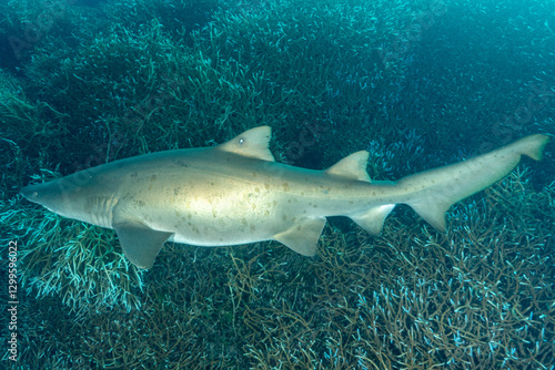 Fototapeta premium 白化したエダサンゴの群生を泳ぐシロワニ 小笠原
