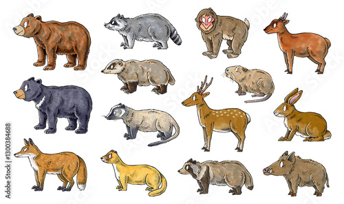 Fototapeta premium 害獣セット(ヒグマ、ツキノワグマ、キツネ、アライグマ、アナグマ、ハクビシン、イタチ、サル、ヌートリア、シカ、タヌキ、キョン、ウサギ、イノシシ)
