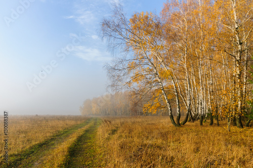 Fototapeta premium Осенний пейзаж с видом дороги вдоль леса с пожелтевшей листвой утром в тумане