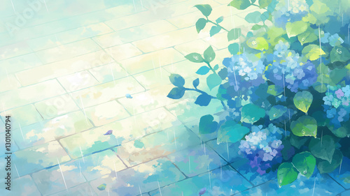 Fototapeta premium 雨上がりの石畳と青い紫陽花|爽やかな季節の背景素材