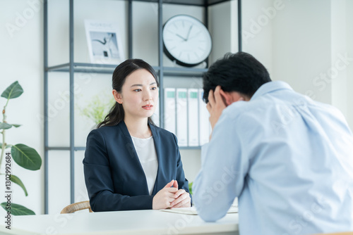 Obraz premium 悩む若い男性の相談にのるプランナーの女性
