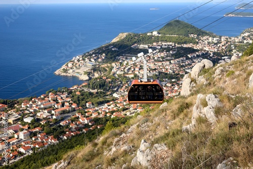 © masyok, Obraz premium ドブロヴニクの山の斜面を昇って行く赤いケーブルカー アドリア海の海の色とドブロブニク旧市街の家々の赤茶色の屋根が素晴らしいコントラストを創り出していた。