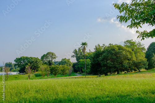 © Kazutaka, Obraz premium 緑豊かな公園の広場と青空