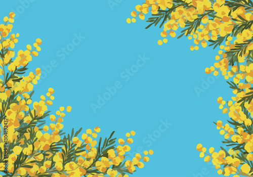 Obraz premium 春の空に咲くミモザのフレーム、ベクター素材