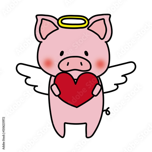 © てがきっず, Naklejka premium 赤いハートを持っている天使の格好をしたぶた