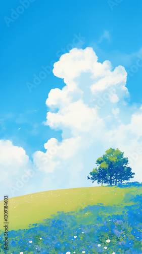 Fototapeta premium 白い雲が浮かぶ青空と花の丘 清涼感たっぷりの自然風景