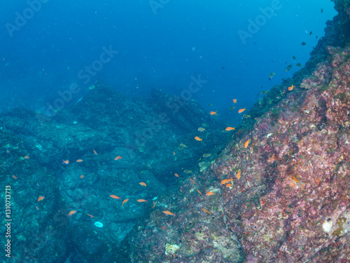 Fototapeta premium 美しいテーブルサンゴとツノダシ(ツノダシ科)、キンギョハナダイ(ハナダイ亜科)、キホシスズメダイ(スズメダイ科)他の群れ。東京都伊豆諸島式根島-2024