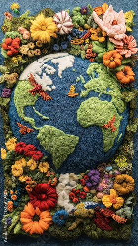 © 963k, Fototapeta premium フェルトと糸で表現された地球|手作りの温もりを感じるエコアート。スマートフォン9:16のアスペクト比