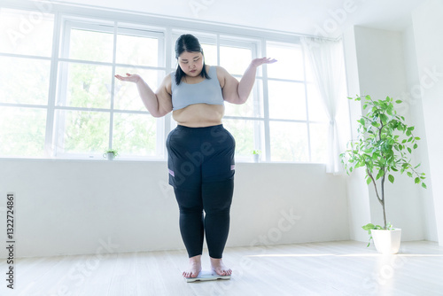 © TAGSTOCK2, Fototapeta premium 体重計に乗って肩をすくめる女性