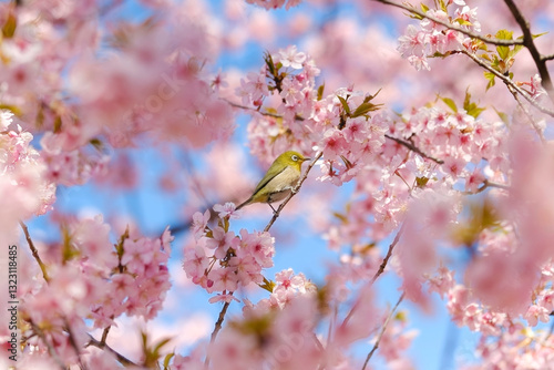 © miyaho, Obraz premium 河津桜とメジロ 日本の春の風景