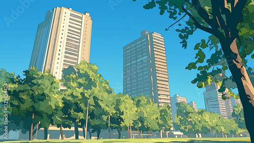 Obraz premium 自然と都市が調和する公園|芝生と木々が広がる美しい都会の景色