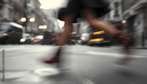 Fototapeta premium ファンタジーストーリー(モノクロームに刻まれた、一瞬のモノローグ—都会の街並みを颯爽と駆け抜ける女性)