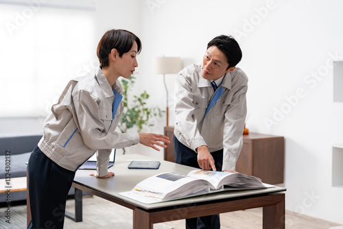 © ponta1414, Fototapeta premium ミーティングをする作業着を着たミドルの男女
