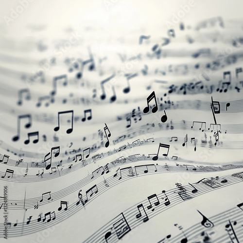 © Mirecat, Obraz premium 楽譜の五線譜の波に踊る音符。音楽