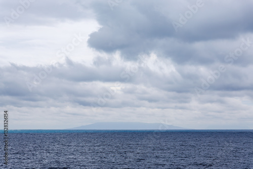 © d3_plus, Obraz premium 美しい式根島の港。 青い海と海岸線の向こうには、新島の白い崖と無人島の早島が見える。 式根島の野伏港に接岸する東海汽船さるびあ丸。 東京都伊豆諸島式根島-2024