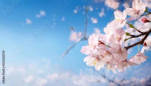 Naklejka premium 青空に桜の枝が一つ配置され、花びらが風に舞う姿が繊細に表現されています。広いコピースペースが穏やかさと清涼感を引き立てるデザイン。...
