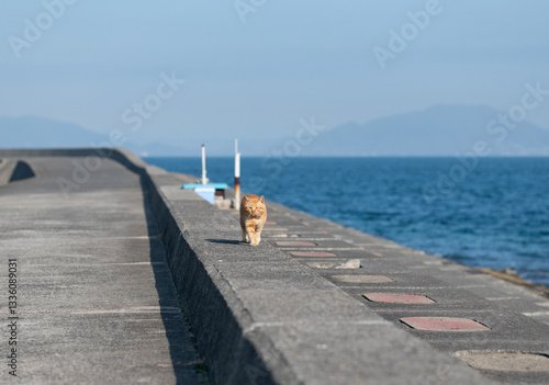 © rai, Obraz premium 堤防を歩く可愛い猫 茶トラ猫
