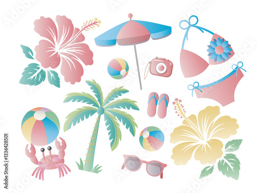 Naklejka premium 夏■夏素材の背景・ハイビスカス&ヤシの木