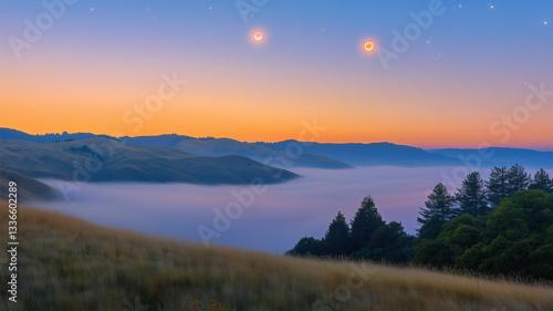 © bephoto, Fototapeta premium 霧に包まれた丘と朝焼けに輝く金星と木星、幻想的な夜明け