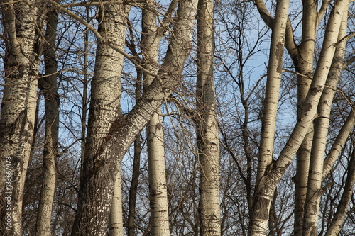 Fototapeta premium Стволы деревьев тополей в весенний солнечный день на фоне голубого неба.