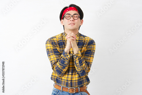 Fototapeta premium アキバ系の男性 祈る 白背景