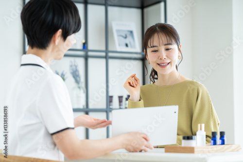 © pain au chocolat, Fototapeta premium エステサロンで肌の相談をする若い女性