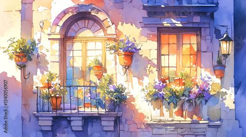 Obraz premium 植木鉢で飾られた窓辺の水彩イラスト風景
