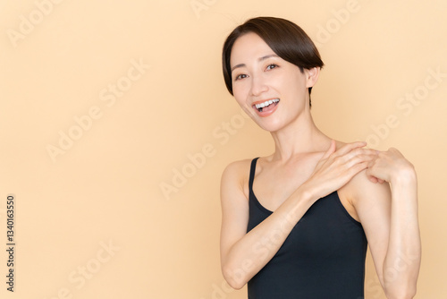 Obraz premium ベージュバックのミドル女性のビューティー