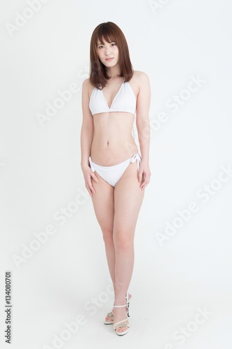 © tomon1683, Obraz premium 白いビキニの水着を着た若い女性の画像。 この画像はスタジオで撮影しています。背景は白です。