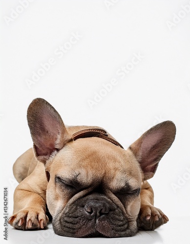 © Shousei, Fototapeta premium ホワイトの無地の背景にコンパクトに丸まったフレンチブルドッグ、フォーンカラーの毛並みと愛らしいシワが際立つシンプルなデザイン