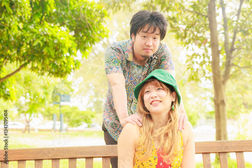 Fototapeta premium ベンチに座る彼女を後ろから抱きしめる彼氏