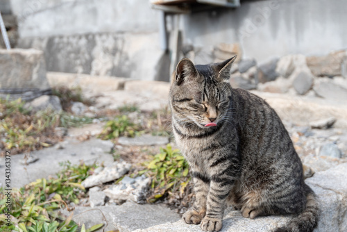 © rai, Obraz premium 塀の上でくつろぐ可愛い野良猫