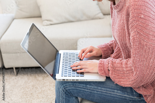 Naklejka premium 部屋でパソコンを見る女性 手元