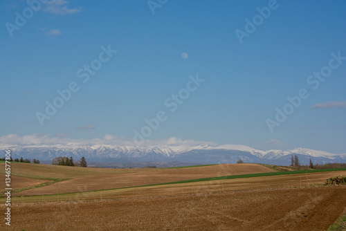 Fototapeta premium 春の晴れた日の畑作地帯と冠雪の山並み