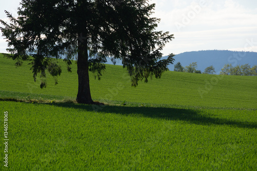 © kinpouge, Obraz premium 緑のムギ畑に立つマツの木 美瑛町