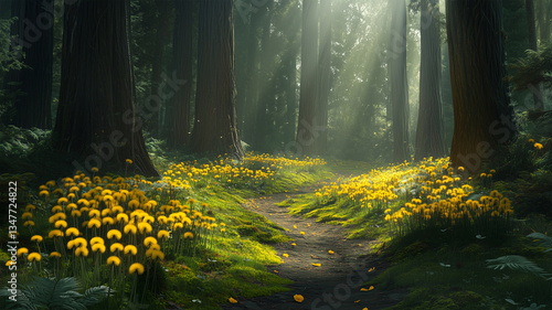 © bephoto, Obraz premium 森の小道とタンポポ — 木漏れ日に輝く自然の美