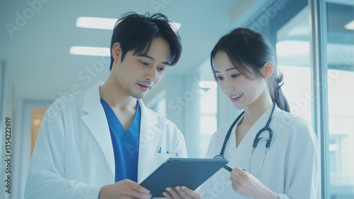 Fototapeta premium タブレットで患者情報を確認する医師と看護師