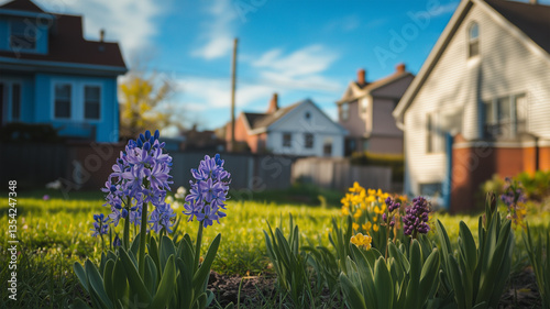 Obraz premium 小さな庭のヒヤシンスと春空が織りなす日常の彩り