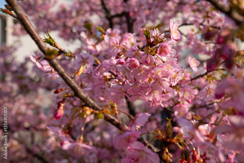 © Bhdr1996, Obraz premium 日本、京都、淀水路、河津桜、桜、春、青空、花、淀、滿開