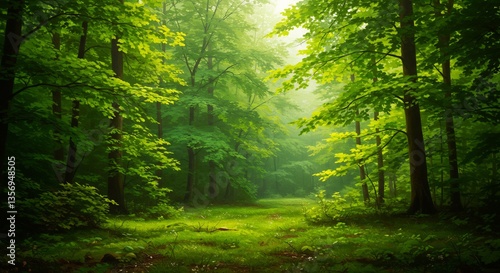Obraz premium 緑輝く森、穏やかな光が差し込む神秘的な風景
