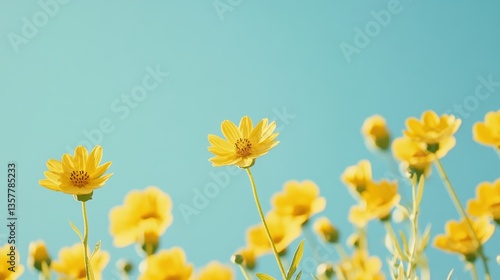 © pham, Fototapeta premium 青空の下で咲く黄色い花々の美しい風景が広がる