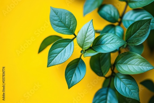 © pham, Obraz premium 緑色の葉が映える黄色い背景の上に配置された植物のバランスの取れた構成