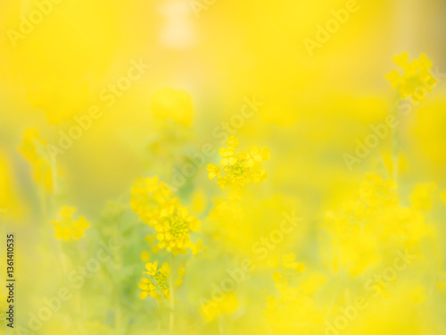 © STOCK THE WORLD, Fototapeta premium 春の公園や花壇を彩る菜の花のある景色。心象風景。背景。自然風景素材。ふんわりとボケた風景。