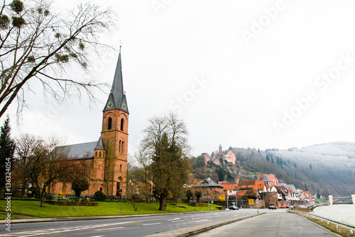 Obraz premium 冬の朝のヒルシュホルン プロテスタント教会(ドイツ)