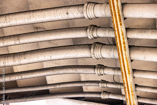 Fototapeta premium 錆びた質感が独特な配管が規則的に並ぶ工業的な背景素材