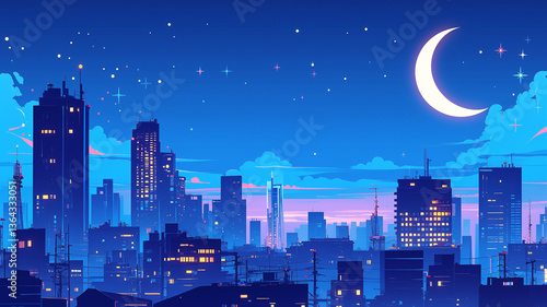 Naklejka premium 1980年代風レトロポップなネオンの都市夜景イラスト・満月とピンクの雲が広がる幻想的な都会の背景素材・ノスタルジックでエモーショナルな未来都市風景・青い夜空・美しい街並み・夜の都市