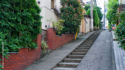 © ToYoPHoTo, Obraz premium 住宅街の急な階段坂道、緑豊かな植栽とレンガ塀のある風景